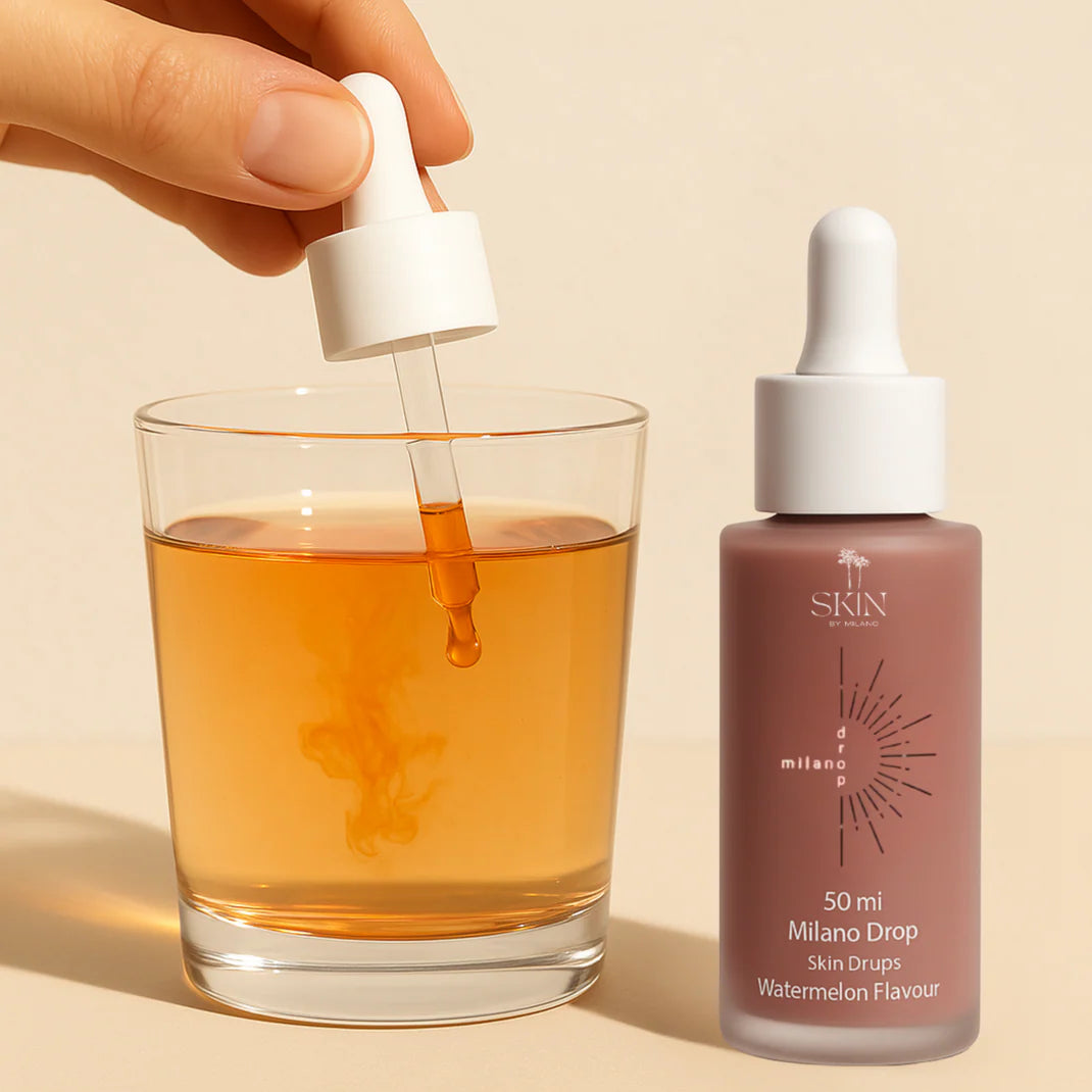 • Diluye 1 ml (aproximadamente 20 gotas) en un vaso de agua o en una botella de agua SkinByMilano.