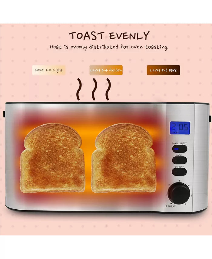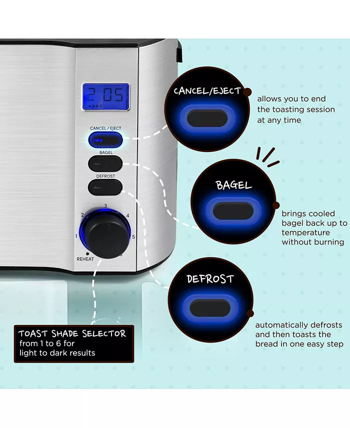 Tostadora digital de ranuras largas para 4 rebanadas, con cuenta regresiva, 6 configuraciones de tostado, bandeja recogemigas extraíble y ranuras extra anchas de 3,8 cm para bagels.