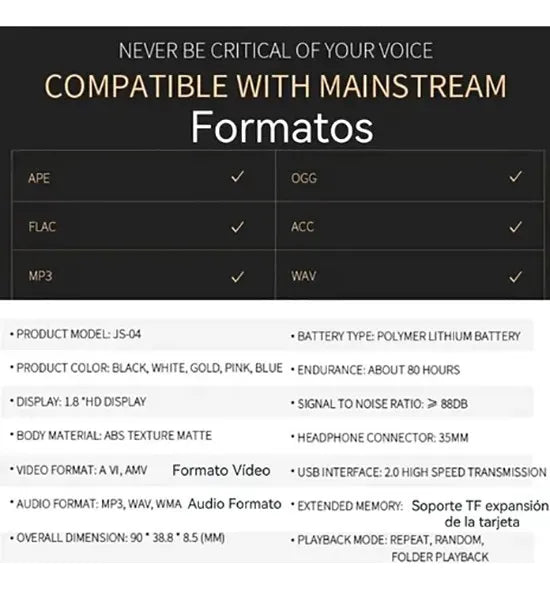 Pantalla: SÍ Tamaño de la pantalla: 1.8 pulgadas Función: grabadora, blutoth, visor fotográfico, lectura de e -eBook, construido en altavoz, radio de ajuste de frecuencia Especificación de la batería: batería de polímero Red inalámbrica: no Estilo: mp3 Tipo de almacenamiento: memoria flash Función de grabación de soporte: Sí Soporte de lectura e -libro: sí Soporte FM: Sí Modo de operación: pantalla táctil + color táctil Embalaje: si ¿Hay un altavoz? Sí Balance: si Memoria externa: si 1.1.8 pulgadas 128 * 160px pantalla TFT 2. Tarjeta de soporte de microSD (TF) a 128 GB (excluyendo) 3. All -Alloy Metal Human Body Music Player 4. Música no destructiva: Professional construido en chip de alta fidelidad, que puede lograr una calidad clara de música y voz. Soporte de formato de audio: APE, FLAC, MP3, WMA, OGG, AAC, WAV. 5. Blutoth 4.1: El reproductor de música MP3 puede igualar fácilmente los auriculares o altavoz inalámbricos Blutoth. No hay problema con el archivo de transmisión De una computadora a un jugador. 6. La operación es simple. Este reproductor de MP3 tiene una tecla de pantalla de bloqueo, por lo que el botón no lo presionará inesperadamente. 7. Tamaño: 90*38.8*8.5 (mm) 8. Peso: 30 g