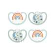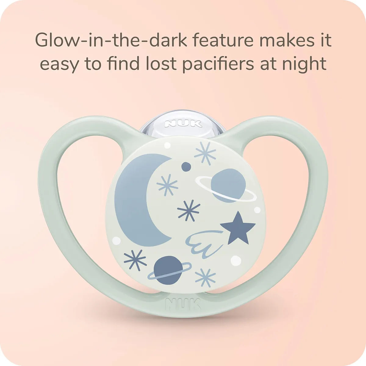 Chupetes ortodónticos NUK Space que brillan en la oscuridad: las aberturas extragrandes del protector proporcionan el máximo flujo de aire y permiten que la piel sensible del bebé respire - La tetina del chupete con forma similar a la de un pecho tiene una forma que calma al bebé igual que a la madre - Ayuda a promover un desarrollo bucal saludable - Aceptada por el 96% de los bebés y no causa confusión en los pezones * *Basado en un estudio de mercado de 2020, probado con 200 usuarios de chupetes - Práctica función que brilla en la oscuridad en uno de los chupetes del paquete de dos y en dos del paquete de cuatro te ayuda a encontrar el chupete perdido por la noche - BPA -gratis y apta para lavavajillas (solo en la rejilla superior)