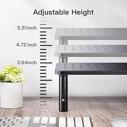 3 ajustes de altura: este soporte para monitor viene con 3 niveles de altura ajustables que te permiten elegir el ángulo de visión más ergonómico, saludable y más cómodo mientras trabajas. Simplemente pulsa el botón en la pierna y levanta la plataforma para ajustar entre los diferentes niveles de altura.
