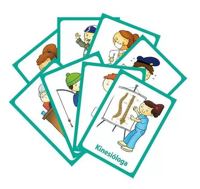 Set de 25 tarjetas con ilustraciones de oficios y profesiones en español. Material didáctico ideal para reforzar el vocabulario y el desarrollo del lenguaje expresivo. Recurso pedagógico que además se utiliza para establecer relaciones sociales.